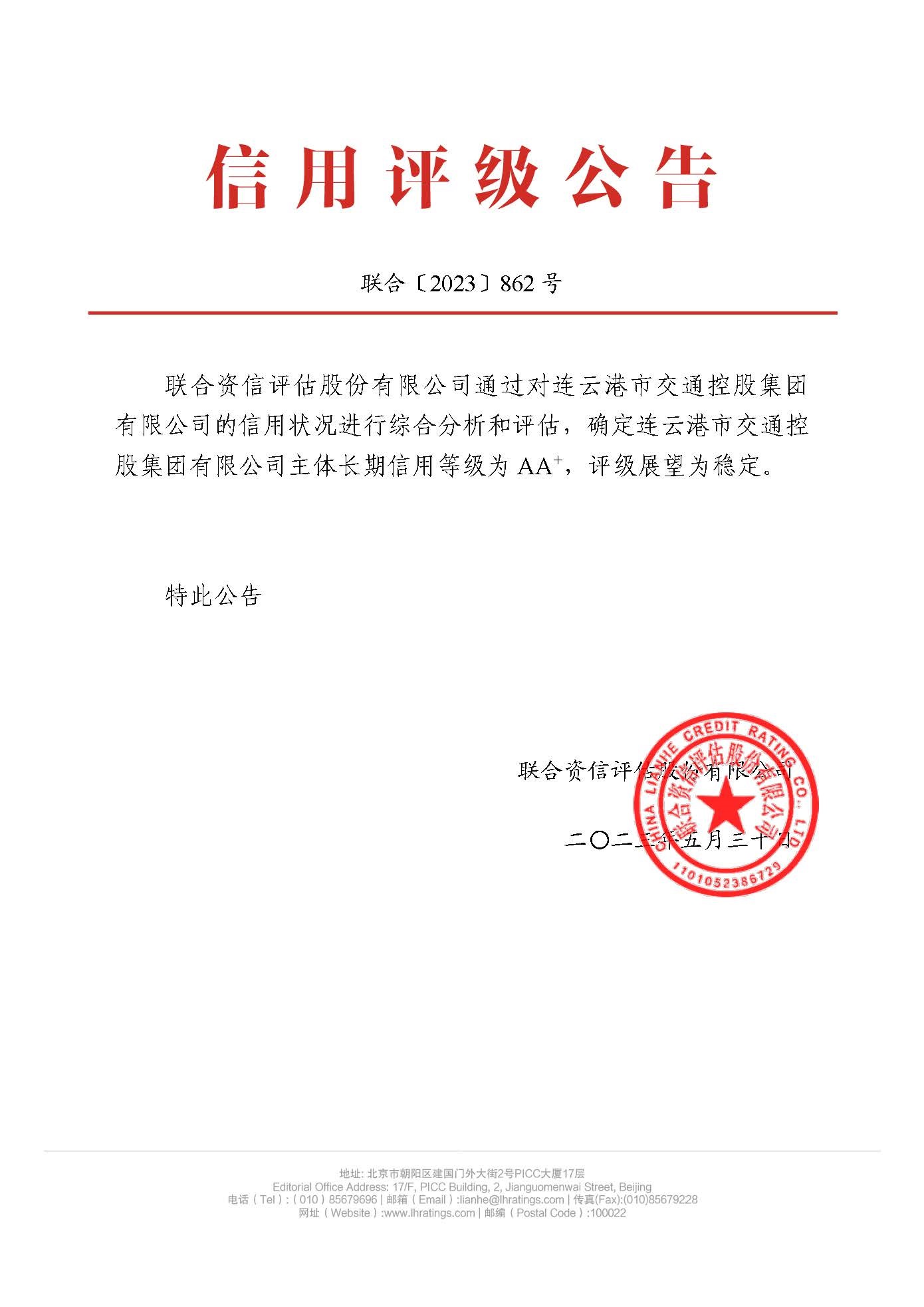 近日,聯(lián)合資信評(píng)估股份有限公司發(fā)布信用評(píng)級(jí)公告,確定連云港市交通控股集團(tuán)有限公司(以下簡(jiǎn)稱“交通控股集團(tuán)”)主體長(zhǎng)期信用等級(jí)為AA+,評(píng)級(jí)展望為穩(wěn)定。