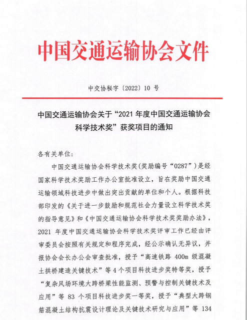 近日,中國(guó)交通運(yùn)輸協(xié)會(huì)發(fā)布了“2021年度中國(guó)交通運(yùn)輸協(xié)會(huì)科學(xué)技術(shù)獎(jiǎng)”獲獎(jiǎng)項(xiàng)目名單,交通集團(tuán)聯(lián)合蘇交科集團(tuán)等單位申報(bào)的“江淮地區(qū)融冰降噪橋面鋪裝磨耗層關(guān)鍵技術(shù)應(yīng)用研究”項(xiàng)目榮獲中國(guó)交通運(yùn)輸協(xié)會(huì)科技進(jìn)步獎(jiǎng)二等獎(jiǎng)。