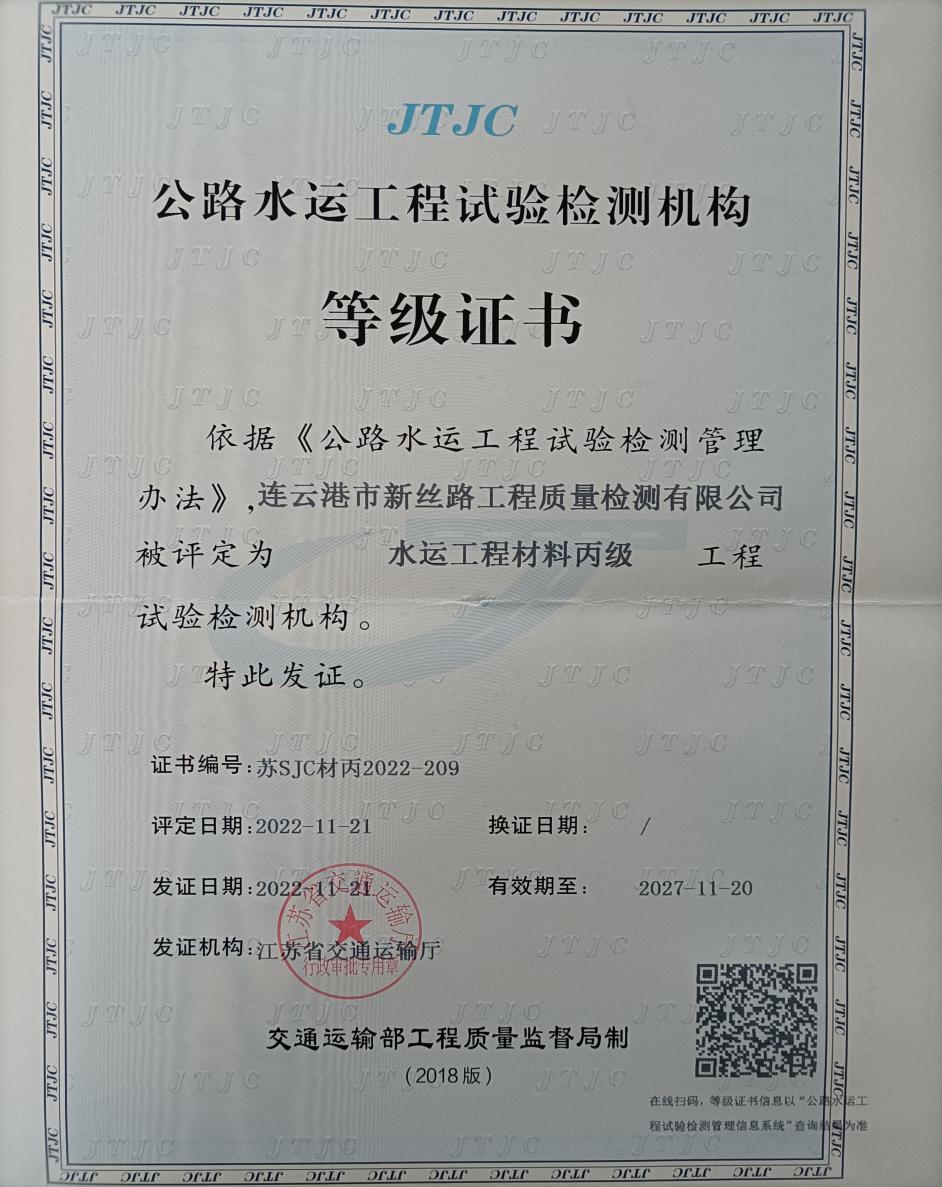 近日,江蘇海建新絲路檢測(cè)公司水運(yùn)工程材料試驗(yàn)檢測(cè)資質(zhì),經(jīng)江蘇省交通運(yùn)輸廳核準(zhǔn),申報(bào)成功并取得證書。