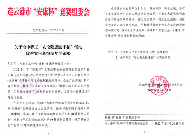近日,從市“安康杯”競賽組委會傳來喜訊,交通控股集團榮獲第八屆全市職工“安全隱患隨手拍”活動優(yōu)秀組織獎,集團1名職工榮獲一等獎、4名職工榮獲二等獎、3名職工榮獲三等獎。