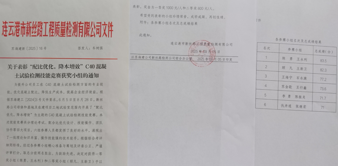 6月至8月,海建新絲路公司成功舉辦C40混凝土“配比優(yōu)化、降本增效”試驗檢測技能競賽,由新絲路公司母體、板橋基地、南延項目三大板塊共6個小組積極參與。