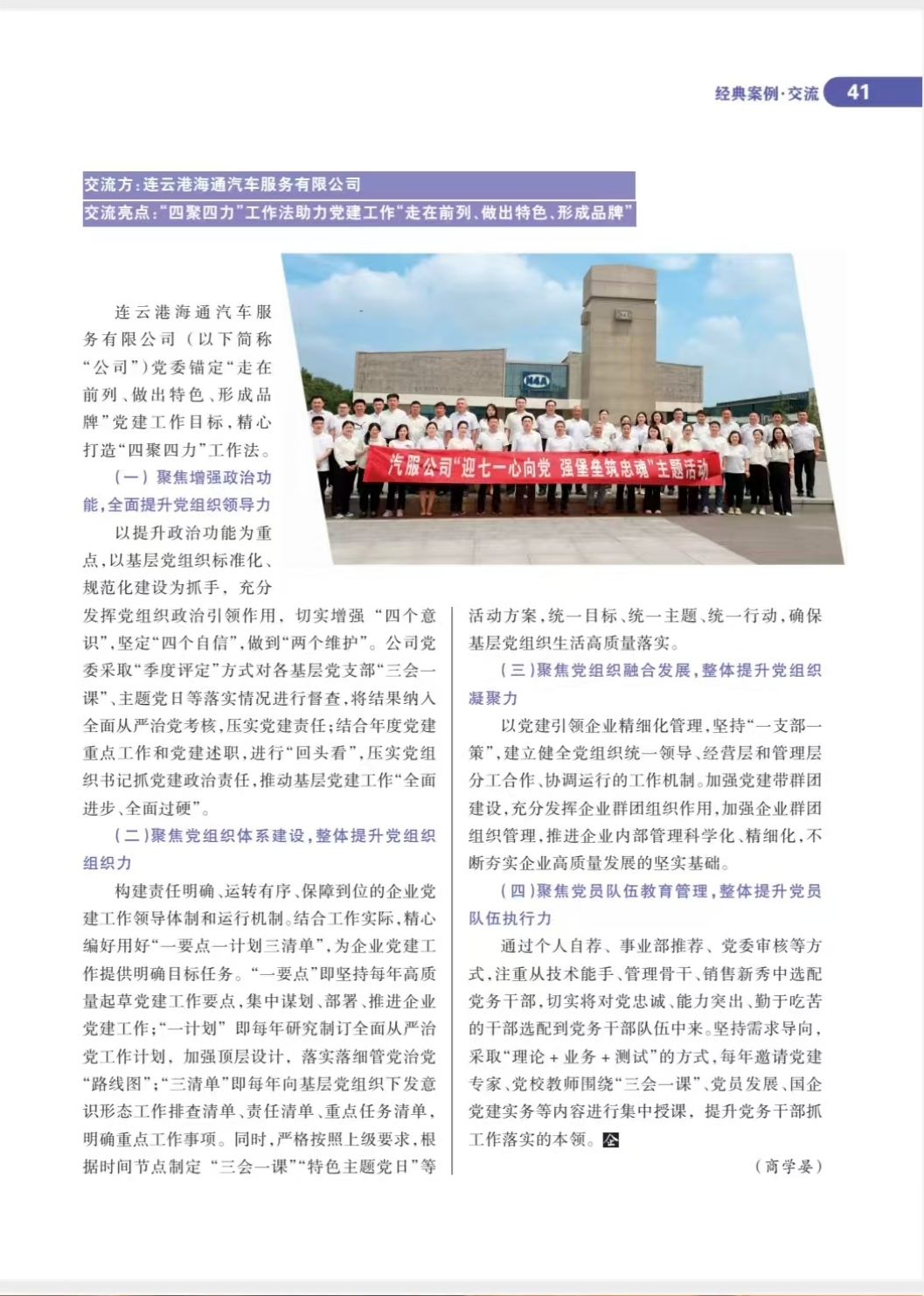 近日,《企業(yè)黨建》雜志2025年第6期“經(jīng)典案例·交流”專(zhuān)欄刊發(fā)文章《連云港海通汽車(chē)服務(wù)有限公司“四聚四力”工作法助力黨建工作“走在前列、做出特色、形成品牌”》。這是汽服公司在全國(guó)國(guó)有企業(yè)黨建領(lǐng)域方面的一次發(fā)聲與展示,現(xiàn)將全文轉(zhuǎn)載如下: