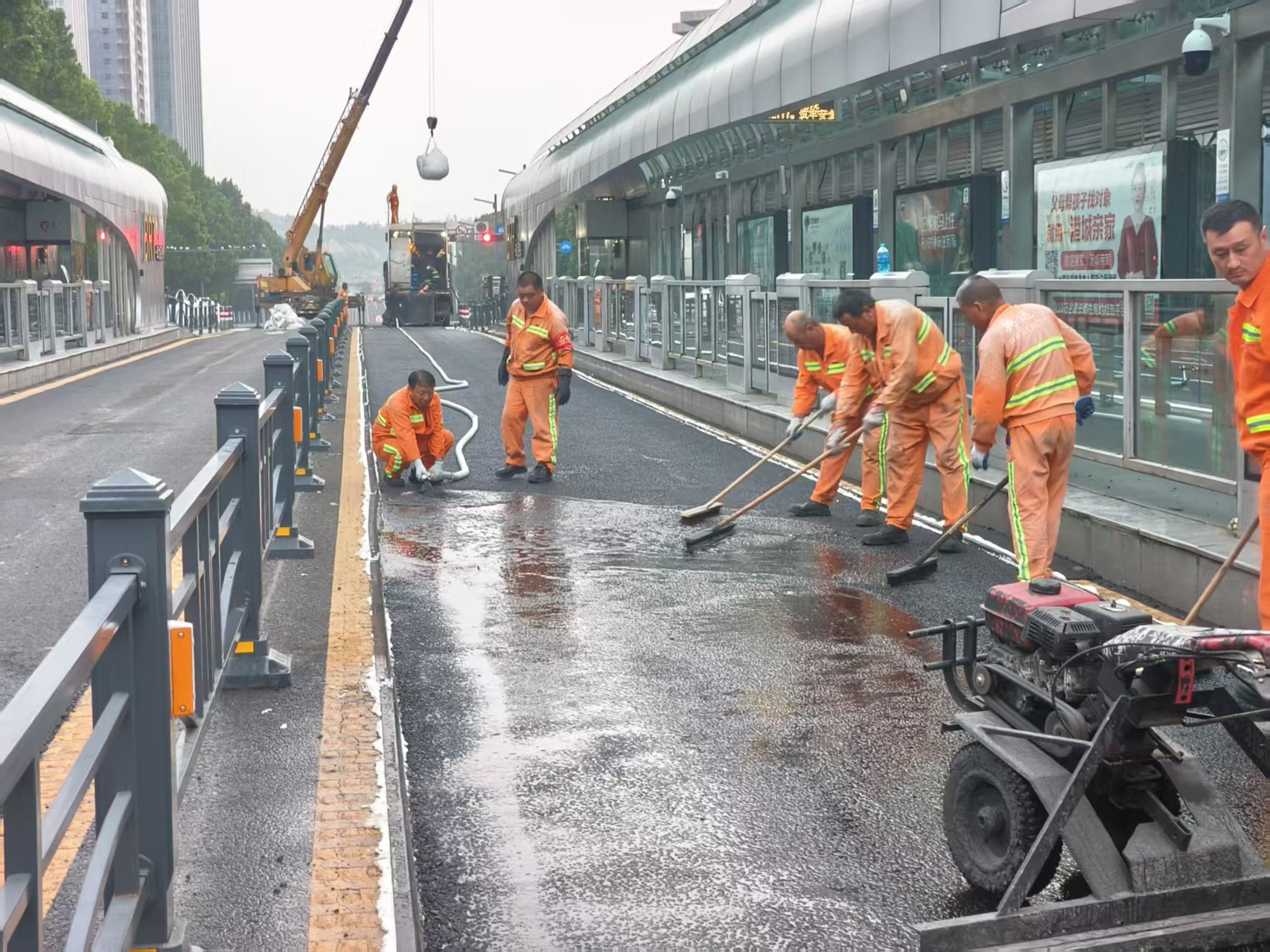 在港城BRT公交站臺專用車道養(yǎng)護(hù)項目中,董入龍創(chuàng)新工作室再次扛起“創(chuàng)新大旗”。公司管養(yǎng)的84個BRT公交站臺60米范圍專用車道,因客流量大、車輛??款l繁,路面車轍病害嚴(yán)重,傳統(tǒng)養(yǎng)護(hù)難以兼顧效率與質(zhì)量。工作室成員共同研判后,選取人流密集的一四九站、墟溝購物中心站及西園路站作為試點(diǎn),引入“灌注式半柔性路面技術(shù)”。為確保技術(shù)落地,董入龍帶領(lǐng)團(tuán)隊開展20余次模擬試驗,精準(zhǔn)把控材料攤鋪厚度、壓實溫度等核心參數(shù);施工期間,他創(chuàng)新采用“分段作業(yè) + 錯峰施工”模式,協(xié)調(diào)公交部門調(diào)整臨時停靠點(diǎn),最終僅用72小時便完成3個站臺專用車道的病害整治。經(jīng)后期跟蹤觀測,試點(diǎn)路段路面平整度、抗滑性能均達(dá)到優(yōu)質(zhì)標(biāo)準(zhǔn)。