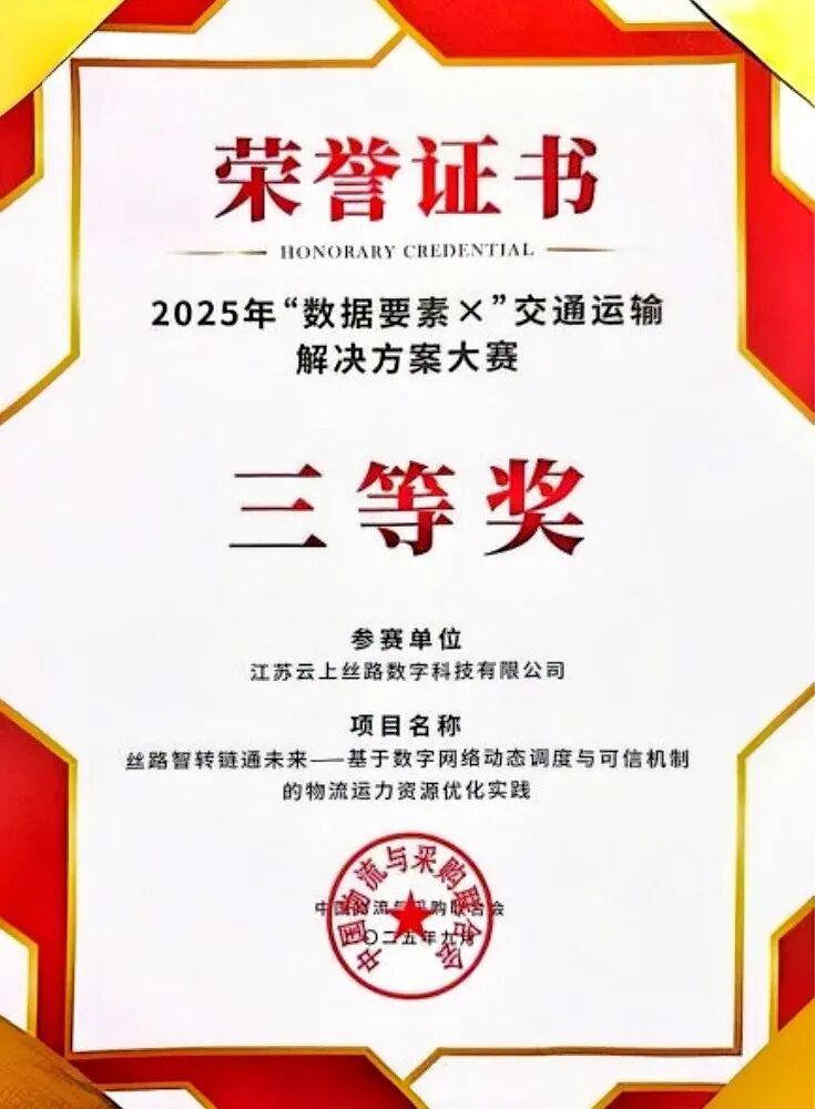 近日,2025中國物流與采購聯(lián)合會(huì)“數(shù)據(jù)要素×”交通運(yùn)輸解決方案大賽全國總決賽在上海落幕,江蘇省物流產(chǎn)業(yè)促進(jìn)會(huì)副會(huì)長單位——江蘇云上絲路數(shù)字科技有限公司憑借“絲路智轉(zhuǎn)鏈通未來——基于數(shù)字網(wǎng)絡(luò)動(dòng)態(tài)調(diào)度與可信機(jī)制的物流運(yùn)力資源優(yōu)化實(shí)踐”項(xiàng)目,獲大賽三等獎(jiǎng)。